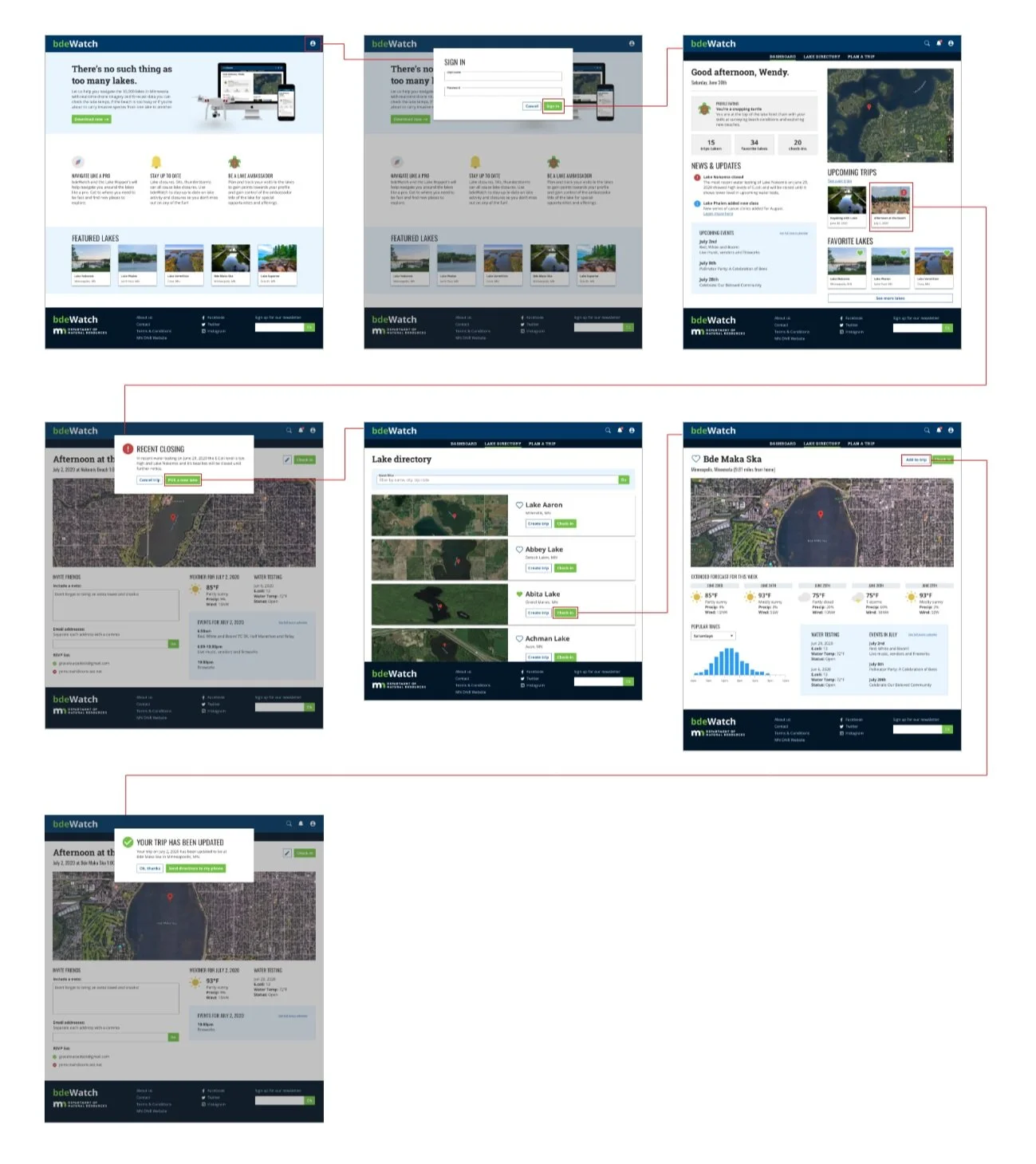 User needs: Wendy spent her childhood exploring the lakes and wants to make sure her kids do the same. She needs help tracking what lakes they’ve visited, lessons or activities available and being up to date on lake conditions and when it’s not too busy.
